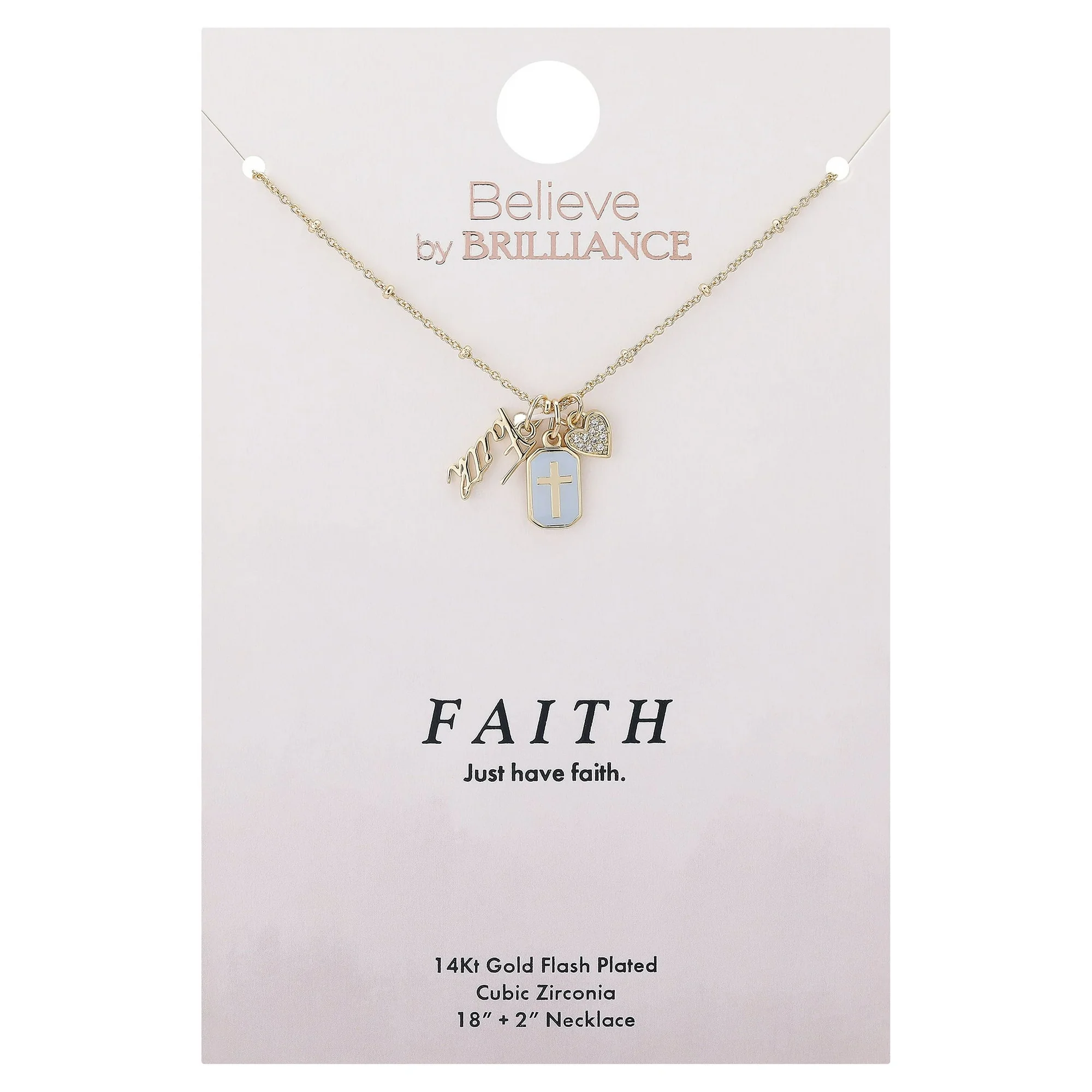 This 14Kt Gold Flash-Plated pendant necklace features dainty faith charms to keep you inspired! A cubic zirconia pave heart, light blue enamel cross tag, and a script “faith” charm adorn this feminine 18+2″ length bead chain. Whether it’s for your mother, wife, sister, daughter or friend, you can’t go wrong with a classic gift from Believe by Brilliance. This jewelry piece comes on a thoughtfully messaged Believe by Brilliance keepsake card, ready for gifting! You might just love it so much that you purchase another to enjoy yourself!